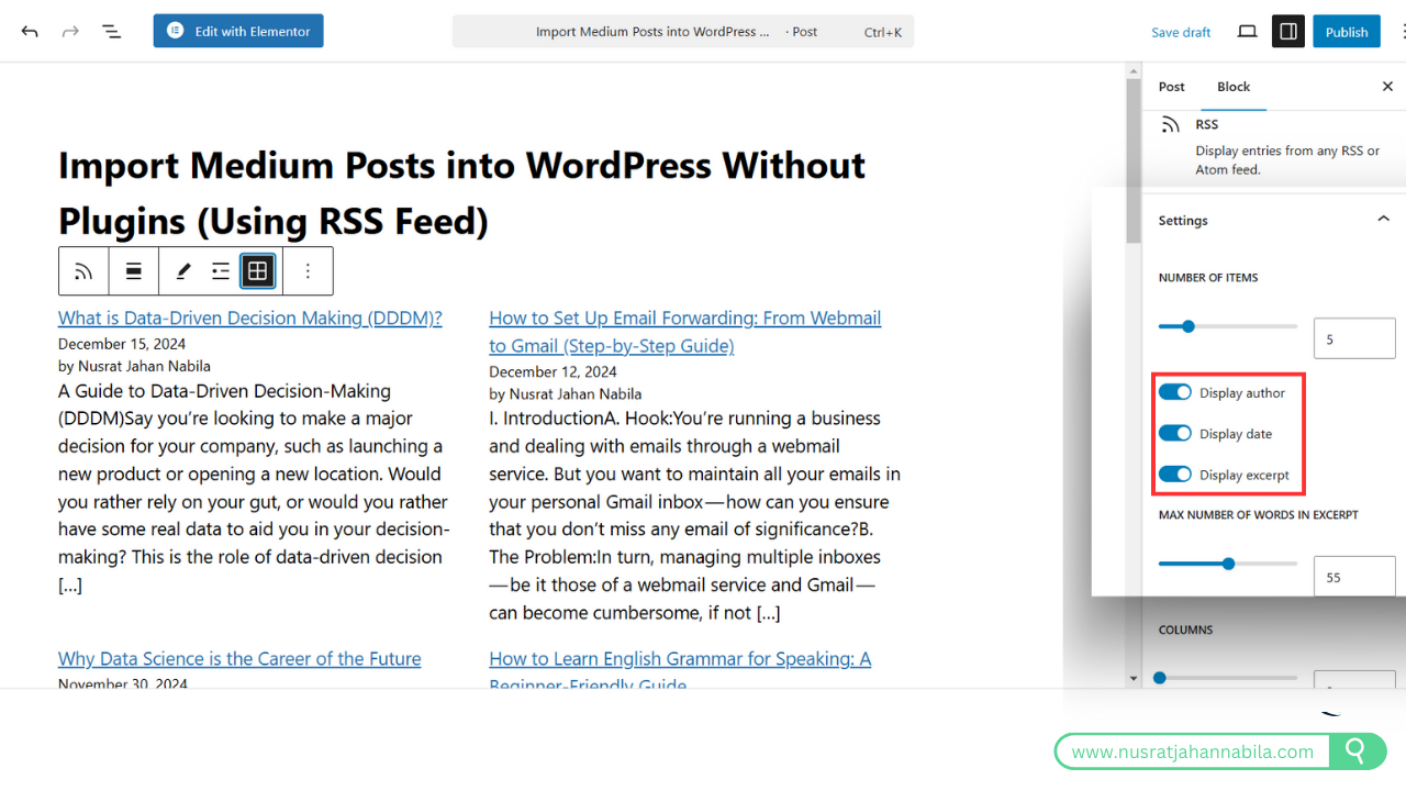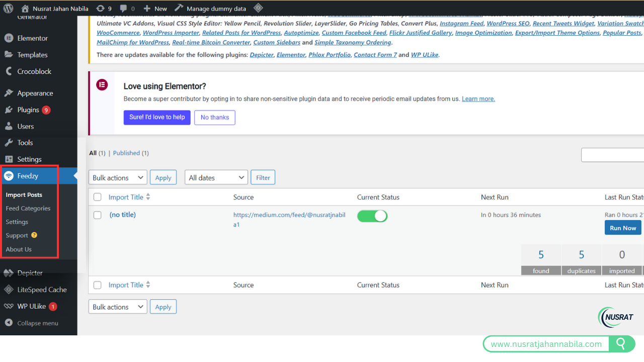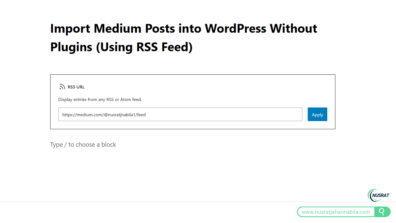 Paste the Medium RSS feed URL (e.g., https://medium.com/@nusratjnabila1/feed) into the Feedzy configuration.